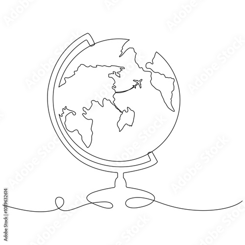The watermark will not be included on Wall mural.: School globe with route path flying airplane continuous line drawing - world map hand drawn linear sy