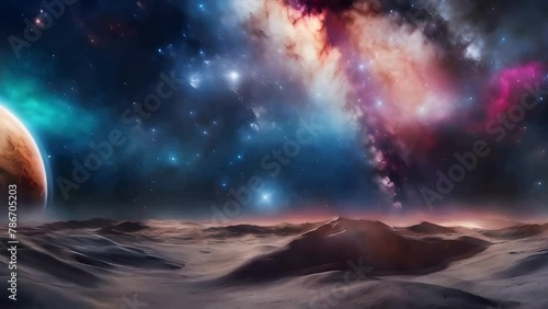 Sci-fi scene depicting a colorful nebula and distant planets viewed from a barren alien desert landsWall mural