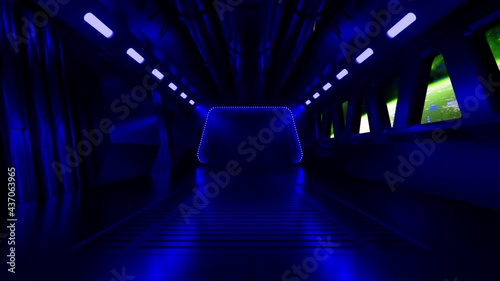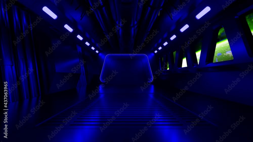 The watermark will not be included on Wall mural.: Sci-fi tunnel in outer space with neon light - planet earth outside the window of the spaceship - spac