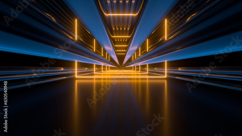 Sci fy neon glowing lines in a dark tunnel - reflections on the floor and ceiling - 3d rendering imageWall mural