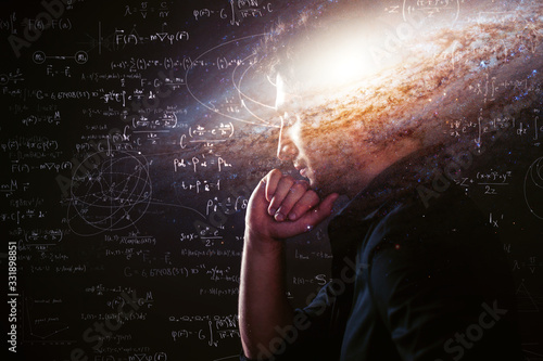 Wall mural science about nature and about man, pensive man with space in the brain and physical and mathematica
