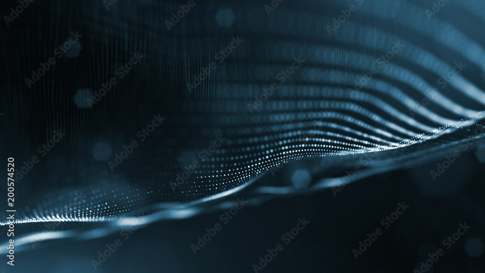 Wall mural science fiction background of glowing particles with depth of field and bokeh. particles form line a