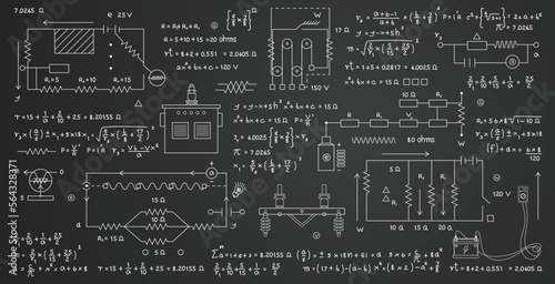 Wall mural scientific formulas for calculating electricity and circuits written on a blackboard.