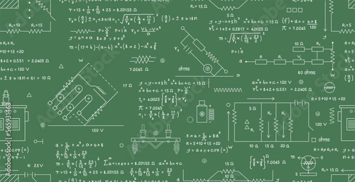 Wall mural scientific formulas for electrical calculations and circuits written on chalkboard seamless pattern.