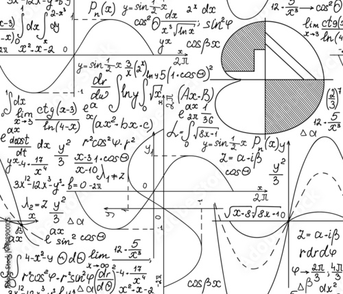 Wall mural scientific math vector seamless pattern with formulas, calculations and geometrical figures handwrit