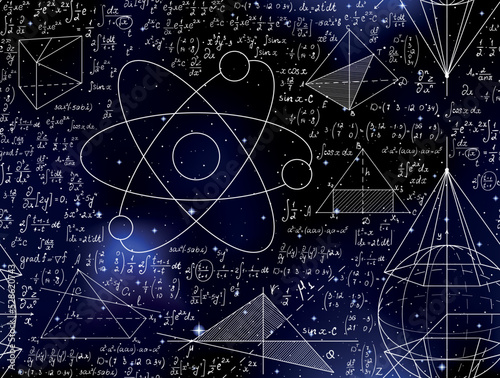 Wall mural scientific vector seamless pattern with handwritten atom formulas, calculations and math figures ove