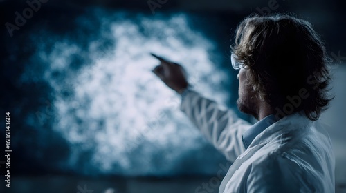 Wall mural scientist analyzing atom structure on a glowing holographic screen in a modern lab