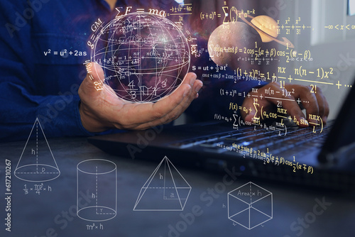 The watermark will not be included on Wall mural.: Scientist holding world and surrounding it with physics or mathematical equations showing ideas for