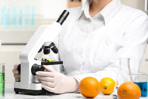 Wall mural : Scientist inspecting slice of apple with microscope in laboratory, closeup - poison detection