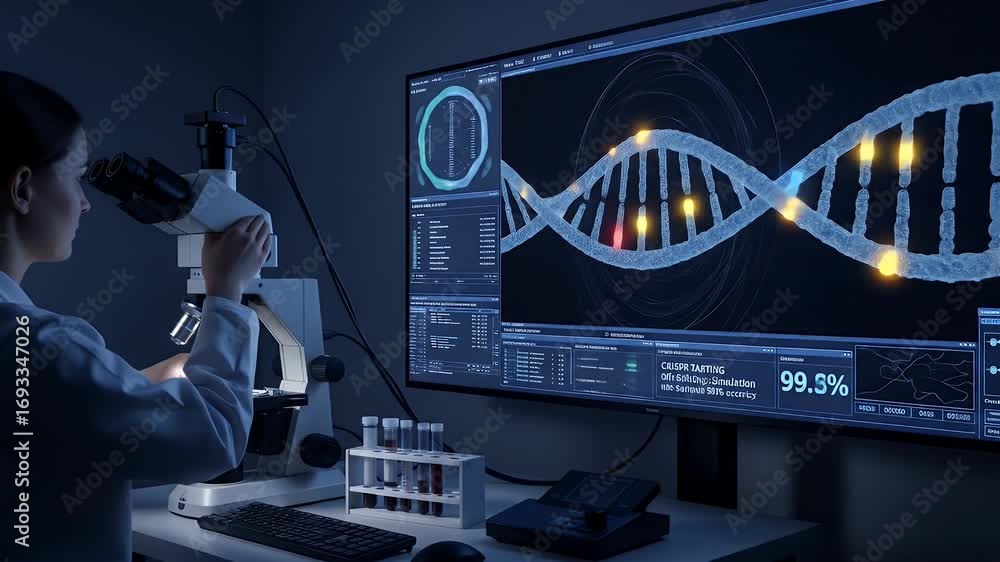 Wall mural scientist using microscope with dna display on computer - Wall murals Wall mural scientist using microscope with dna display on computer - Wall murals