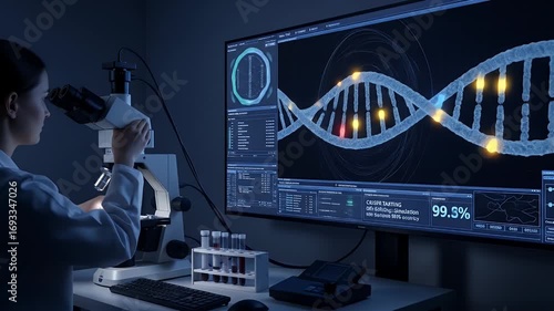 The watermark will not be included on Wall mural.: Scientist using microscope with dna display on computer