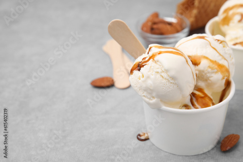 The watermark will not be included on Wall mural.: Scoops of ice cream with caramel sauce in paper cup on light grey table, closeup - space for text