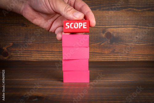 The watermark will not be included on Wall mural.: Scope concept - red blocks in a pile on a wooden texture background