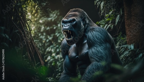 Wall mural screaming angry aggressive gorilla in a forest. generative ai
