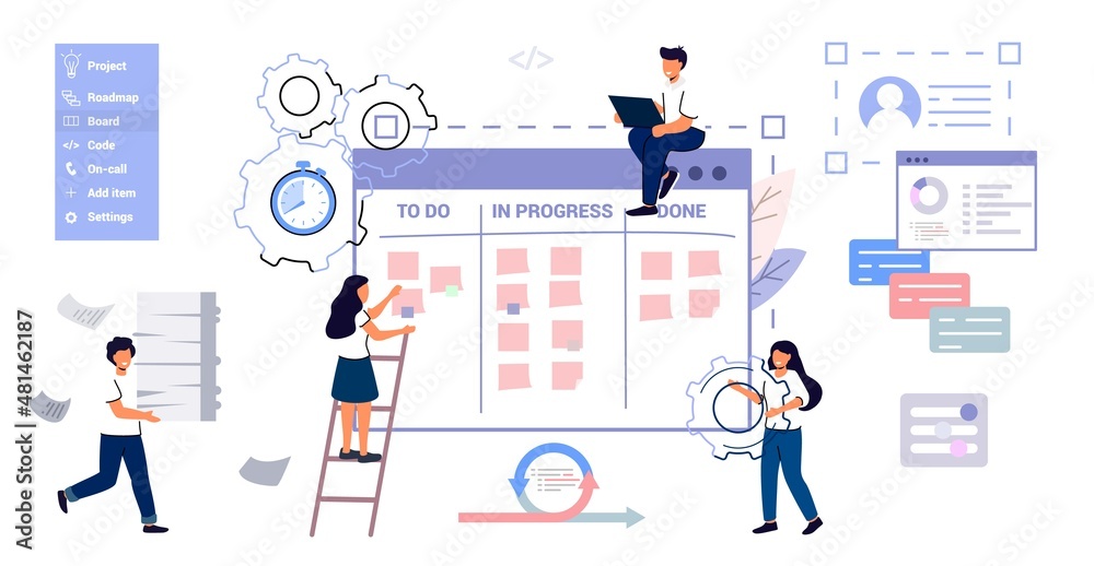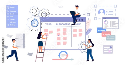 Wall mural : Scrum task board agile organizer with people sticking papers on it analyzing process of software dev