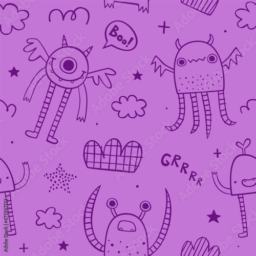 Wall mural seamless doodle pattern with sketch monsters for baby. scribble vector print with naive outline mons