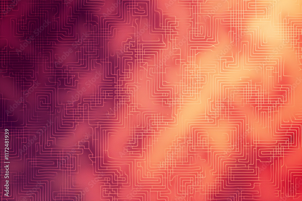 The watermark will not be included on Wall mural.: Seamless geometric maze pattern in shades of gradient red with circuit-like digital lines creating a