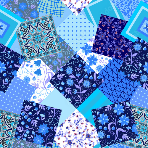 Wall mural seamless patchwork pattern with floral and abstract patterns in blue tones. chaotically located patc