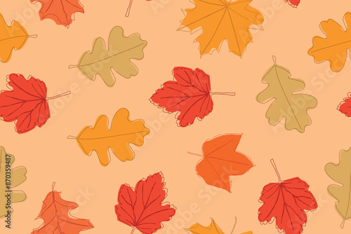 Wall mural : Seamless pattern of bright autumn leaves drawn in a continuous line - autumn leaf in one line style -