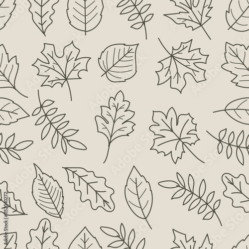 The watermark will not be included on Wall mural.: Seamless pattern of leaves in black line art isolated on brown background