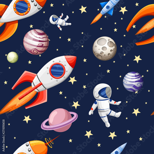 Wall mural : Seamless pattern of space elements cartoon design space rockets planets stars and cosmonaut flat vec