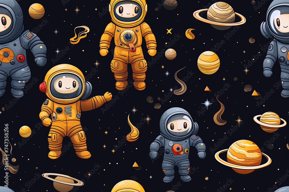 The watermark will not be included on Wall mural.: Seamless pattern with cute cartoon characters astronauts in space on black background - texture for d