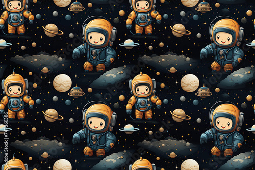 Wall mural seamless pattern with cute cartoon characters astronauts in space on black background. texture for d - Wall murals Wall mural seamless pattern with cute cartoon characters astronauts in space on black background. texture for d - Wall murals