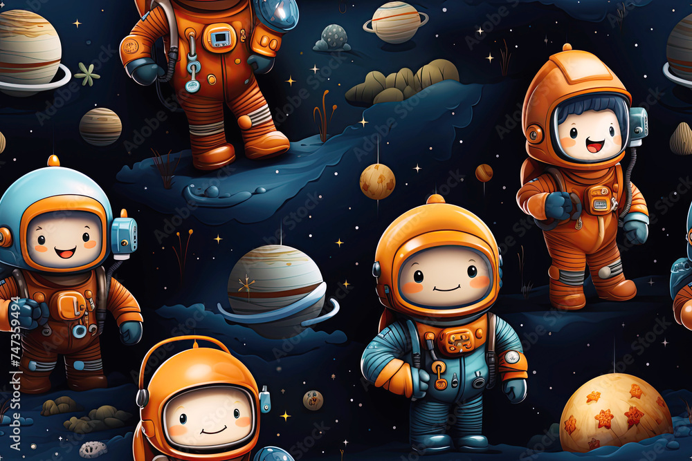 The watermark will not be included on Wall mural.: Seamless pattern with cute cartoon characters astronauts in space on dark blue background - texture f