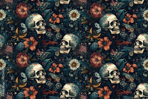 Wall mural : Seamless pattern with skulls and flowers on background with texture - generative ai illustration