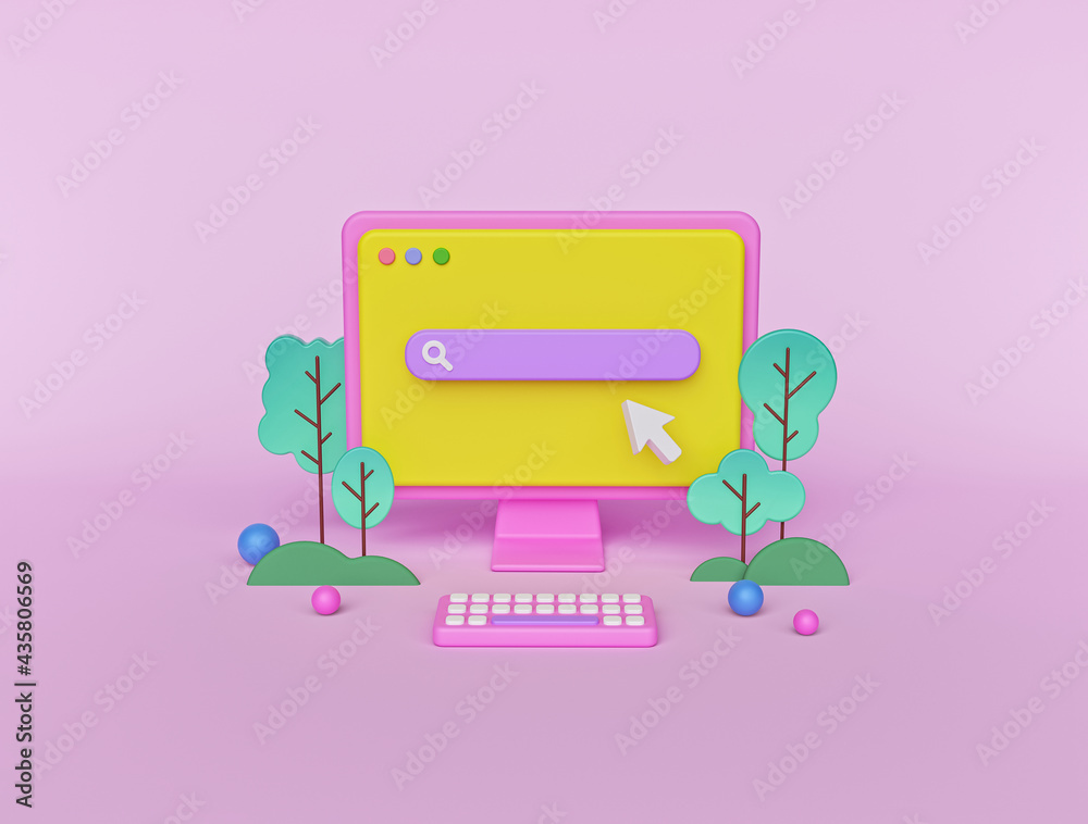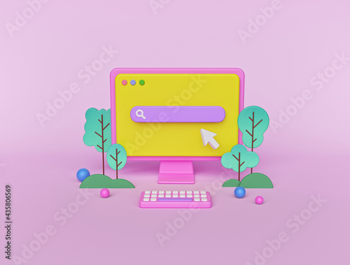 Wall mural search bar on computer monitor isolated on pastel pink background. minimal web search concept. 3d re