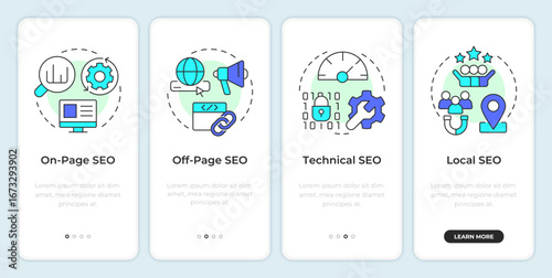 Wall mural : Search engine optimization onboarding mobile app screen - walkthrough 4 steps editable graphic instru