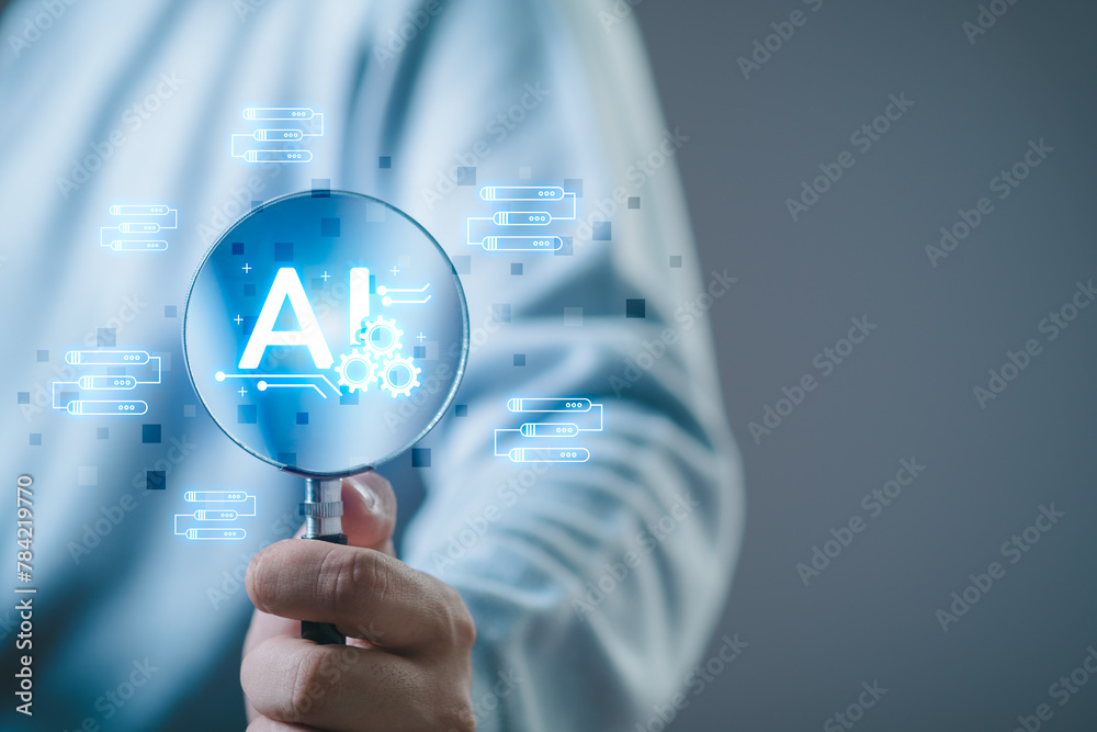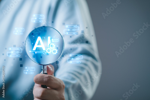 Wall mural searching for information in technology with ai systems concept, businessman hand holding magnifying