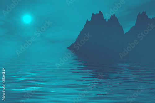Wall mural : Seascape of the mountain moon through the clouds bllue color - 3d rendering 3d illustration