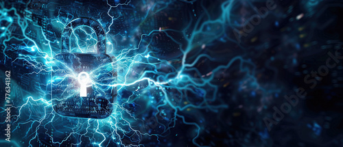 Wall mural secure digital space with cyber lock and lightning on dark data background, protection of computer i