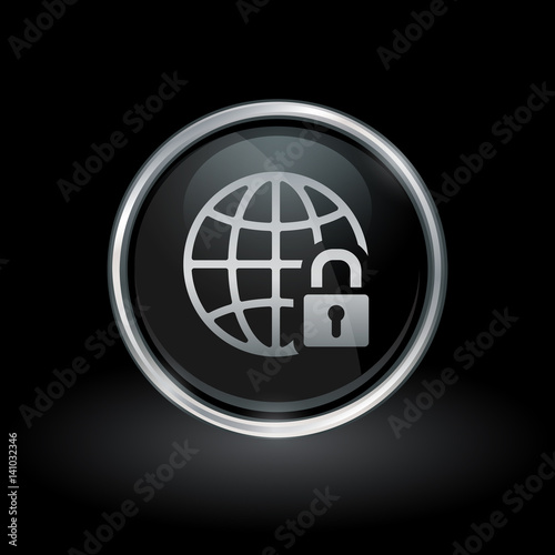 Wall mural secure global network symbol with globe and padlock icon inside round chrome silver and black button