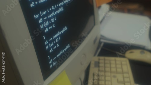 Wall mural : Selective focus close-up of old computer monitor with code on screen on table in 90s office