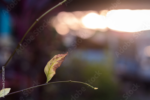 Wall mural : Selective focus of single leaf on branch with blurred nature and orange sky in twilight of the day w