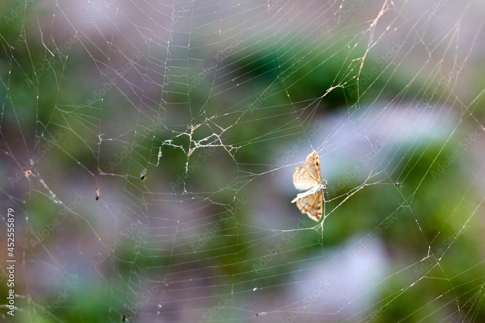 The watermark will not be included on Wall mural.: Selective focus on a moth caught in a spider's web