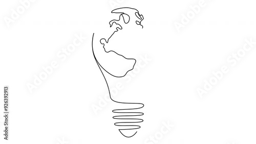 The watermark will not be included on Wall mural.: Self drawing animation of continuous one line art of light bulb with earth globe inside - hand drawn