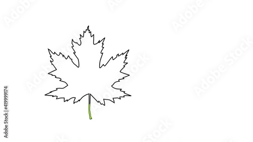 Wall mural : Self drawing animation of green maple leaf outline - copy space - white background - alpha channel -