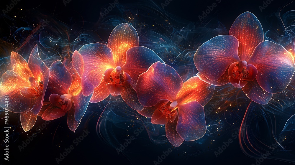 Wall mural semiabstract design of glowing neon orchids entwined with vines their petals dissolving into vibrant - Wall murals Wall mural semiabstract design of glowing neon orchids entwined with vines their petals dissolving into vibrant - Wall murals