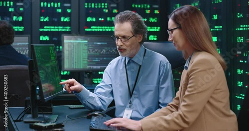 The watermark will not be included on Wall mural.: Senior employee of system administrator with glasses sits at table with female intern programmer and