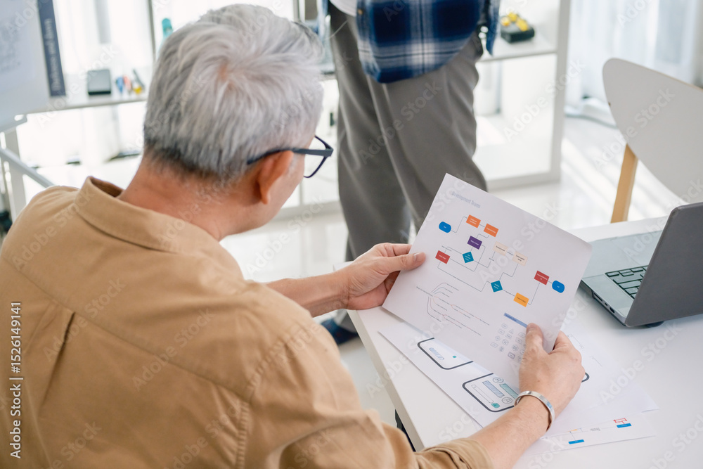 The watermark will not be included on Wall mural.: Senior programmer planning software development with flowchart and system process documentation at o