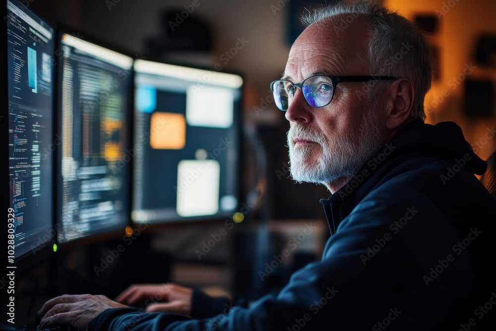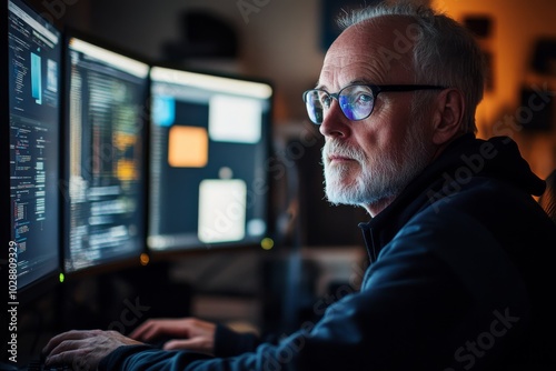 The watermark will not be included on Wall mural.: Senior programmer working late at night on coding project