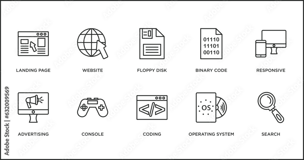 Seo outline icons set - thin line icons such as floppy disk, binary code, responsive, advertising, coWall mural