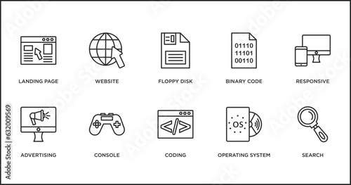 Wall mural seo outline icons set. thin line icons such as floppy disk, binary code, responsive, advertising, co