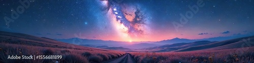 The watermark will not be included on Wall mural.: Serene celestial landscape starlight illuminates rolling hills and distant galaxies in a vast, ether