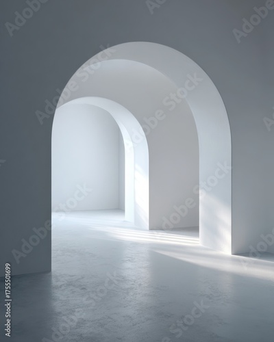 The watermark will not be included on Wall mural.: Serene empty white room with elegant archways and soft light
