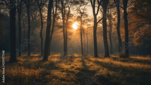 Wall mural : Serene forest atmosphere at dawn with sunlight filtering through trees and space for text overlay