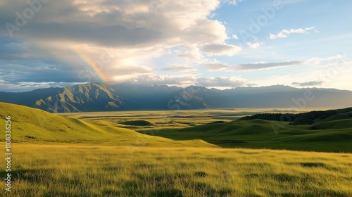 The watermark will not be included on Wall mural.: Serene landscape with rolling hills and mountains under a colorful sky at sunset